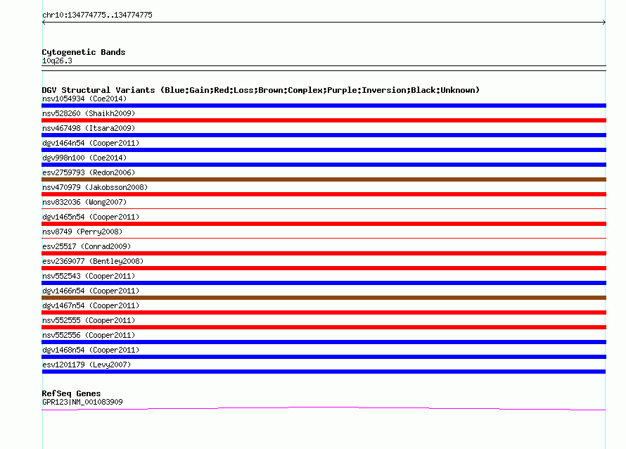 Variant DetailsVariant: esv1201179| Internal ID | 12364302 | | Landmark | | | Location Information | | | Cytoband | 10q26.3 | | Allele length | | Assembly | Allele length | | hg38 | 126 | | hg19 | 126 | | hg18 | 126 |
