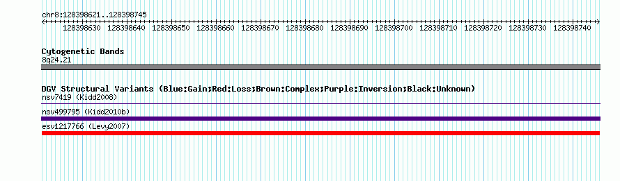 Variant DetailsVariant: esv1217766| Internal ID | 12380889 | | Landmark | | | Location Information | | | Cytoband | 8q24.21 | | Allele length | | Assembly | Allele length | | hg38 | 125 | | hg19 | 125 | | hg18 | 125 |