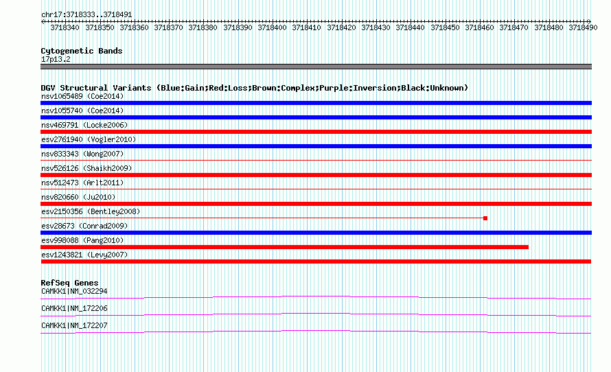 Variant DetailsVariant: esv1243821| Internal ID | 12406944 | | Landmark | | | Location Information | | | Cytoband | 17p13.2 | | Allele length | | Assembly | Allele length | | hg38 | 159 | | hg19 | 159 | | hg18 | 159 |