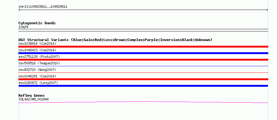 | | Variant Type | CNV insertion | | Copy Number | | | Allele State | | | Allele Origin | | | Probe Count | | | Validation Flag | | | Merged Status | M | | Merged Variants | | | Supporting Variants | essv4108073 | | Samples | HuRef | | Known Genes | COL4A2 | | Method | Sequencing | | Analysis | | | Platform | Sanger Sequencing | | Comments | | | Reference | Levy_et_al_2007 | | Pubmed ID | 17803354 | | Accession Number(s) | esv1260872