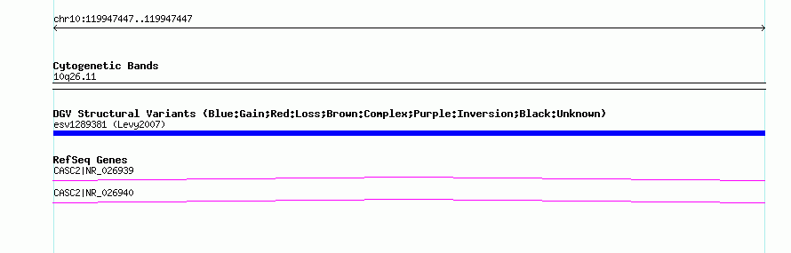 | | Variant Type | CNV insertion | | Copy Number | | | Allele State | | | Allele Origin | | | Probe Count | | | Validation Flag | | | Merged Status | M | | Merged Variants | | | Supporting Variants | essv4078293 | | Samples | HuRef | | Known Genes | CASC2 | | Method | Sequencing | | Analysis | | | Platform | Sanger Sequencing | | Comments | | | Reference | Levy_et_al_2007 | | Pubmed ID | 17803354 | | Accession Number(s) | esv1289381