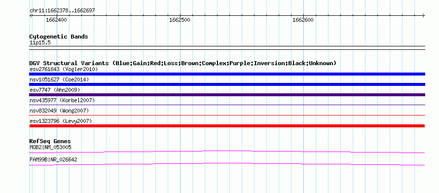 Variant DetailsVariant: esv1323796| Internal ID | 12486918 | | Landmark | | | Location Information | | | Cytoband | 11p15.5 | | Allele length | | Assembly | Allele length | | hg38 | 320 | | hg19 | 320 | | hg18 | 320 |
