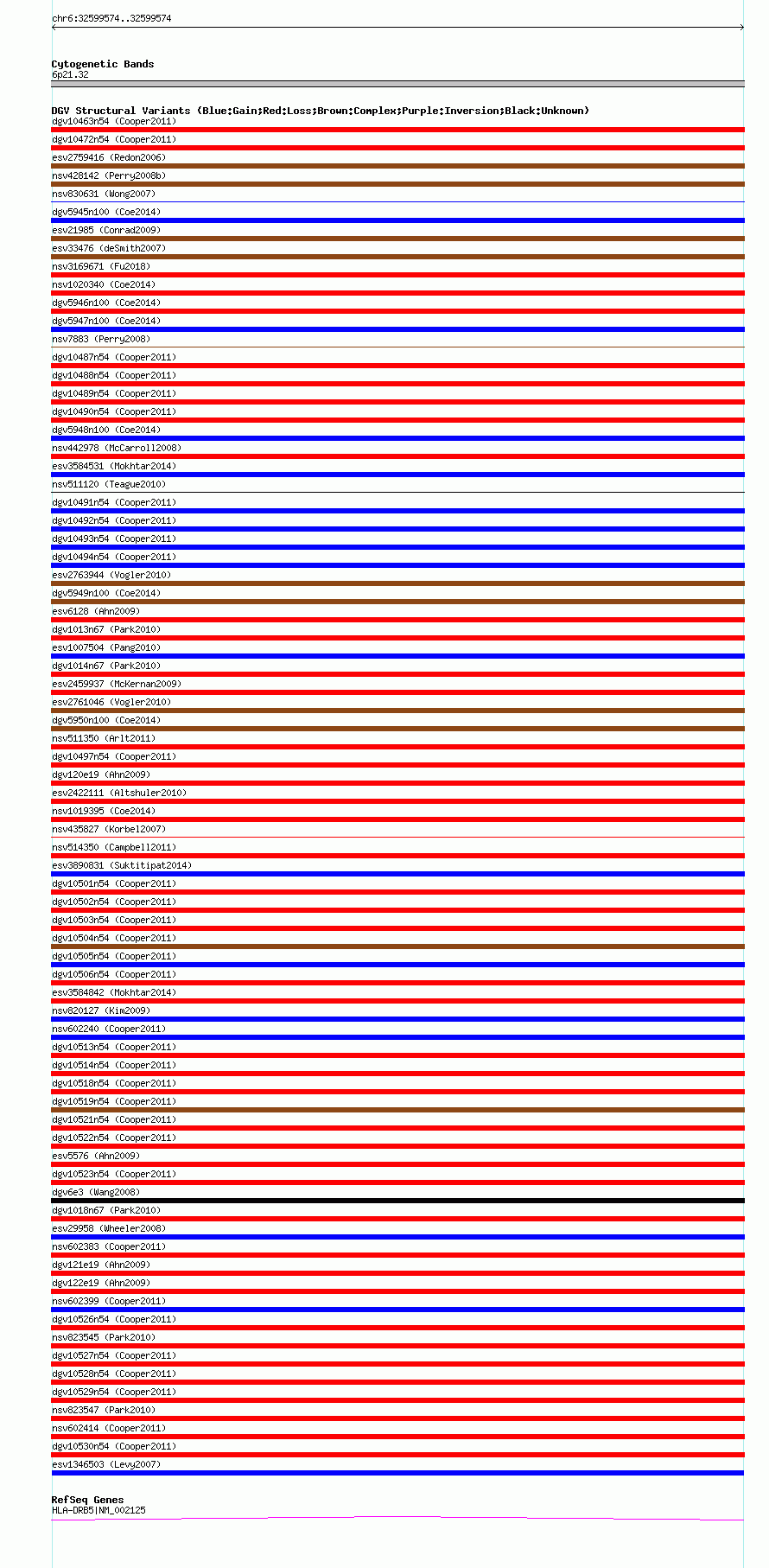 Variant DetailsVariant: esv1346503| Internal ID | 12509626 | | Landmark | | | Location Information | | | Cytoband | 6p21.32 | | Allele length | | Assembly | Allele length | | hg38 | 307 | | hg19 | 307 | | hg18 | 307 |