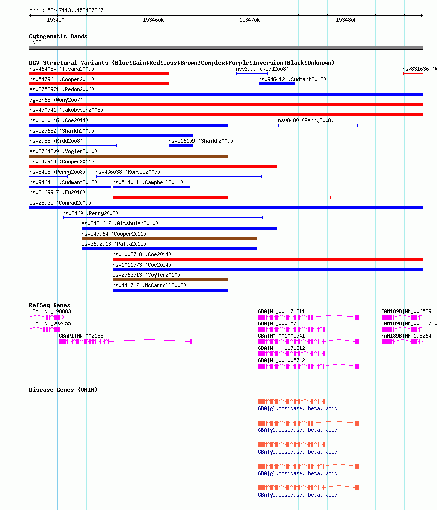 | | Variant Type | CNV gain | | Copy Number | | | Allele State | | | Allele Origin | | | Probe Count | | | Validation Flag | | | Merged Status | M | | Merged Variants | esv28935 | | Supporting Variants | essv46432, essv82829 | | Samples | NA19190, NA19129 | | Known Genes | FAM189B, GBA, GBAP1, MTX1 | | Method | Oligo aCGH | | Analysis | Segment log2 ratios from each sample. This was done running the GADA algorithm (Pique-Regi et al., 2008) using the options "-M 10 -T 10 -a 2.5". Filter non-CNV segments using intensity thresholds. Merge remaining CNV "calls" within each sample. Adjacent calls of the same direction (gain or loss) are merged if both: the distance between calls is less than 10kb, and the distance between calls is less than 10% of the size of the largest of the two calls. | | Platform | Sanger H. Sapiens 42mCGH Array 5781_53 726K v1 | | Comments | | | Reference | Conrad_et_al_2009 | | Pubmed ID | 19812545 | | Accession Number(s) | esv13606