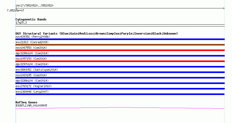 Variant DetailsVariant: esv1364448| Internal ID | 12527570 | | Landmark | | | Location Information | | | Cytoband | 17q25.3 | | Allele length | | Assembly | Allele length | | hg38 | 50 | | hg19 | 50 | | hg18 | 50 |