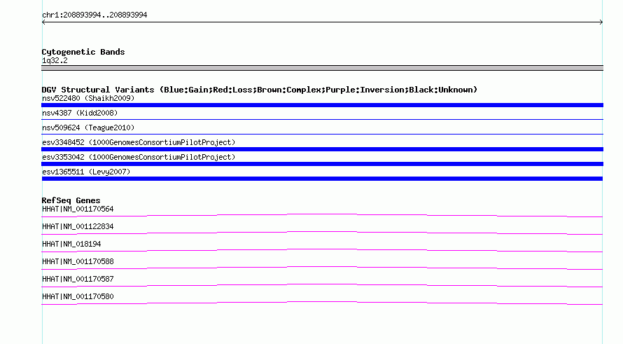 Variant DetailsVariant: esv1365511| Internal ID | 12528633 | | Landmark | | | Location Information | | | Cytoband | 1q32.2 | | Allele length | | Assembly | Allele length | | hg38 | 166 | | hg19 | 166 | | hg18 | 166 |