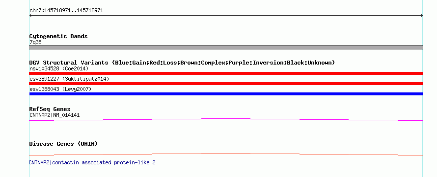 | | Variant Type | CNV insertion | | Copy Number | | | Allele State | | | Allele Origin | | | Probe Count | | | Validation Flag | | | Merged Status | M | | Merged Variants | | | Supporting Variants | essv4031146 | | Samples | HuRef | | Known Genes | CNTNAP2 | | Method | Sequencing | | Analysis | | | Platform | Sanger Sequencing | | Comments | | | Reference | Levy_et_al_2007 | | Pubmed ID | 17803354 | | Accession Number(s) | esv1388043