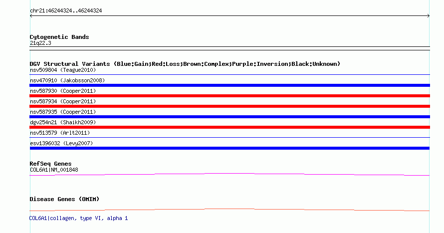 Variant DetailsVariant: esv1396032| Internal ID | 12559154 | | Landmark | | | Location Information | | | Cytoband | 21q22.3 | | Allele length | | Assembly | Allele length | | hg38 | 66 | | hg19 | 66 | | hg18 | 66 |