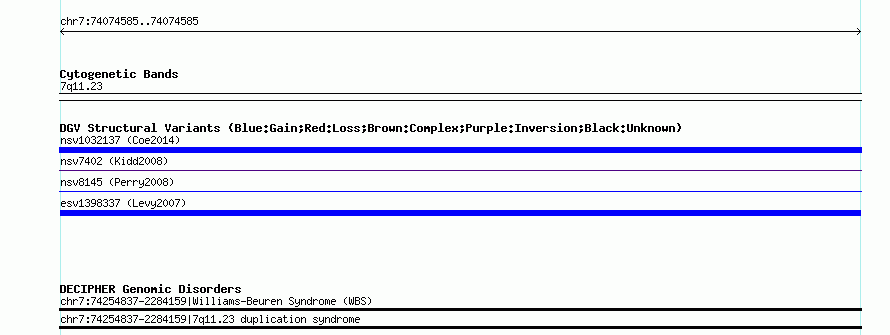 Variant DetailsVariant: esv1398337| Internal ID | 12561459 | | Landmark | | | Location Information | | | Cytoband | 7q11.23 | | Allele length | | Assembly | Allele length | | hg38 | 57 | | hg19 | 57 | | hg18 | 57 |
