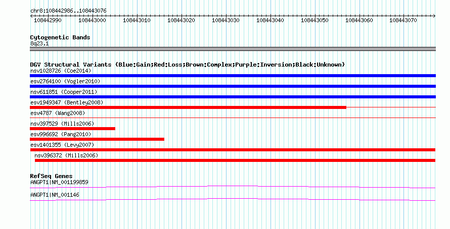 Variant DetailsVariant: esv1401355| Internal ID | 12564478 | | Landmark | | | Location Information | | | Cytoband | 8q23.1 | | Allele length | | Assembly | Allele length | | hg38 | 91 | | hg19 | 91 | | hg18 | 91 |