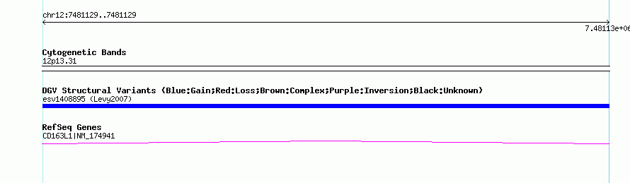 Variant DetailsVariant: esv1408895| Internal ID | 12572017 | | Landmark | | | Location Information | | | Cytoband | 12p13.31 | | Allele length | | Assembly | Allele length | | hg38 | 99 | | hg19 | 99 | | hg18 | 99 |