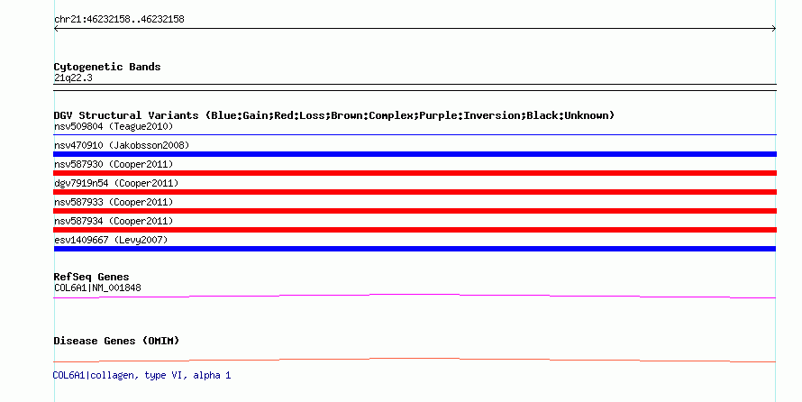 Variant DetailsVariant: esv1409667| Internal ID | 12572789 | | Landmark | | | Location Information | | | Cytoband | 21q22.3 | | Allele length | | Assembly | Allele length | | hg38 | 71 | | hg19 | 71 | | hg18 | 71 |