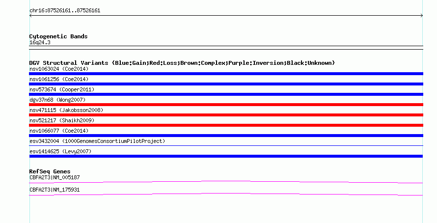 Variant DetailsVariant: esv1414625| Internal ID | 12577747 | | Landmark | | | Location Information | | | Cytoband | 16q24.3 | | Allele length | | Assembly | Allele length | | hg38 | 66 | | hg19 | 66 | | hg18 | 66 |