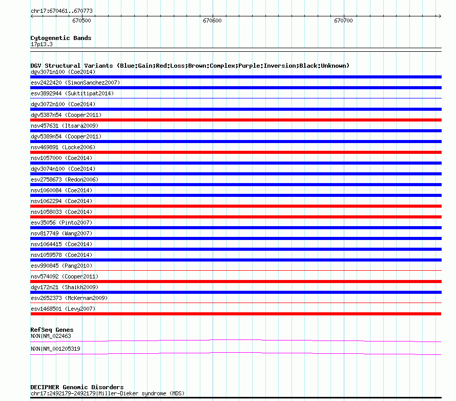 Variant DetailsVariant: esv1468501| Internal ID | 12631623 | | Landmark | | | Location Information | | | Cytoband | 17p13.3 | | Allele length | | Assembly | Allele length | | hg38 | 313 | | hg19 | 313 | | hg18 | 313 |