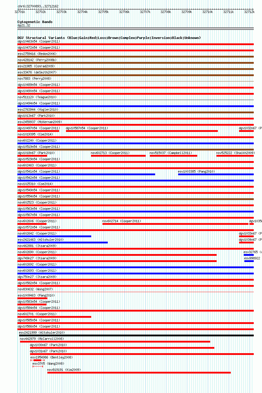 | Variant DetailsVariant: esv14863| Internal ID | 11032097 |  | Landmark |  |  | Location Information |  |  | Cytoband | 6p21.32 |  | Allele length | | Assembly | Allele length |  | hg38 | 11270 |  | hg19 | 11270 |  | hg18 | 11270 |