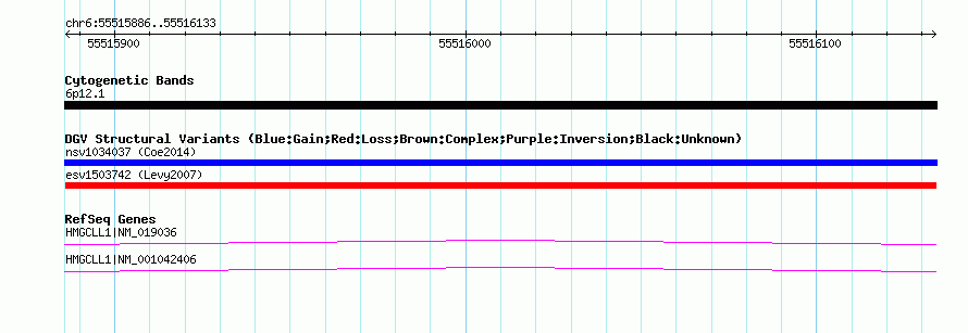 | | Variant Type | CNV deletion | | Copy Number | | | Allele State | | | Allele Origin | | | Probe Count | | | Validation Flag | | | Merged Status | M | | Merged Variants | | | Supporting Variants | essv3860307 | | Samples | HuRef | | Known Genes | HMGCLL1 | | Method | Sequencing | | Analysis | | | Platform | Sanger Sequencing | | Comments | | | Reference | Levy_et_al_2007 | | Pubmed ID | 17803354 | | Accession Number(s) | esv1503742