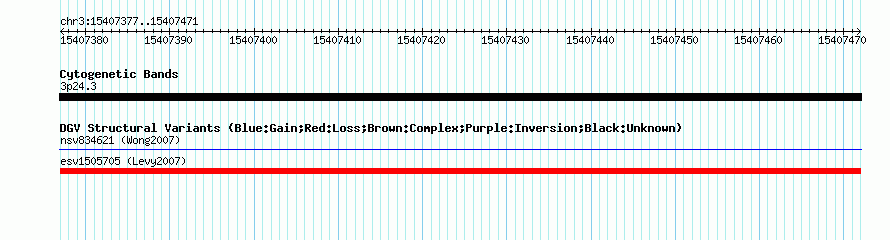 Variant DetailsVariant: esv1505705| Internal ID | 12668827 | | Landmark | | | Location Information | | | Cytoband | 3p24.3 | | Allele length | | Assembly | Allele length | | hg38 | 95 | | hg19 | 95 | | hg18 | 95 |