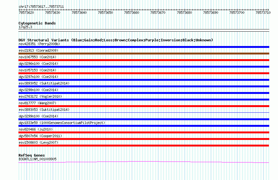 Variant DetailsVariant: esv1508603| Internal ID | 12671725 | | Landmark | | | Location Information | | | Cytoband | 17q25.3 | | Allele length | | Assembly | Allele length | | hg38 | 95 | | hg19 | 95 | | hg18 | 95 |