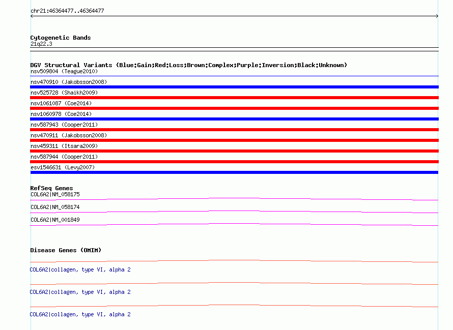 Variant DetailsVariant: esv1546631| Internal ID | 12709752 | | Landmark | | | Location Information | | | Cytoband | 21q22.3 | | Allele length | | Assembly | Allele length | | hg38 | 57 | | hg19 | 57 | | hg18 | 57 |