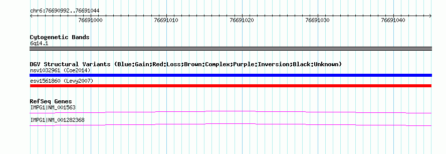 Variant DetailsVariant: esv1561860| Internal ID | 12724981 | | Landmark | | | Location Information | | | Cytoband | 6q14.1 | | Allele length | | Assembly | Allele length | | hg38 | 53 | | hg19 | 53 | | hg18 | 53 |