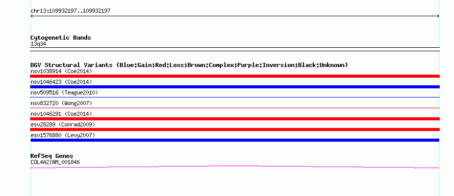 | | Variant Type | CNV insertion | | Copy Number | | | Allele State | | | Allele Origin | | | Probe Count | | | Validation Flag | | | Merged Status | M | | Merged Variants | | | Supporting Variants | essv3667277 | | Samples | HuRef | | Known Genes | COL4A2 | | Method | Sequencing | | Analysis | | | Platform | Sanger Sequencing | | Comments | | | Reference | Levy_et_al_2007 | | Pubmed ID | 17803354 | | Accession Number(s) | esv1576880