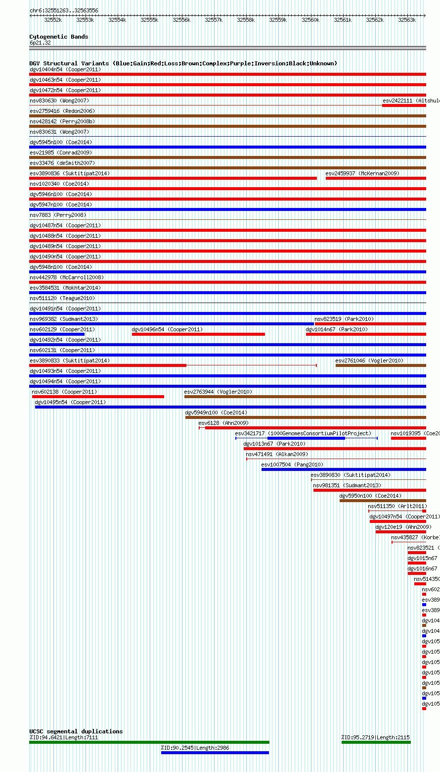 | Variant DetailsVariant: esv15932| Internal ID | 11033166 |  | Landmark |  |  | Location Information |  |  | Cytoband | 6p21.32 |  | Allele length | | Assembly | Allele length |  | hg38 | 12294 |  | hg19 | 12294 |  | hg18 | 12294 |