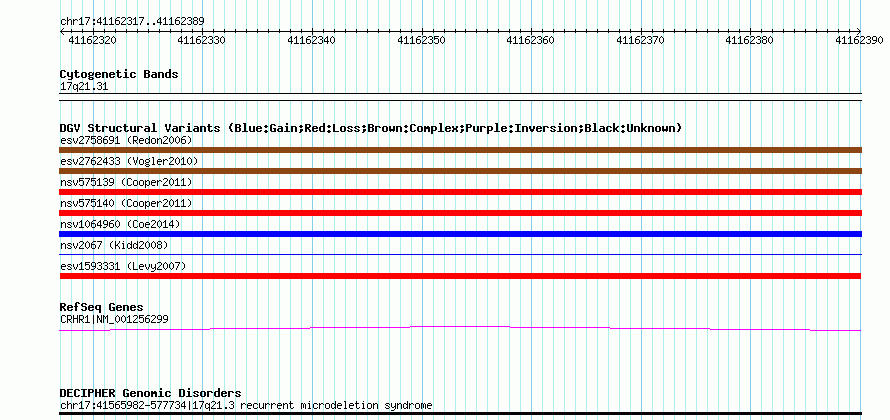 Variant DetailsVariant: esv1593331| Internal ID | 12756452 | | Landmark | | | Location Information | | | Cytoband | 17q21.31 | | Allele length | | Assembly | Allele length | | hg38 | 73 | | hg19 | 73 | | hg18 | 73 |