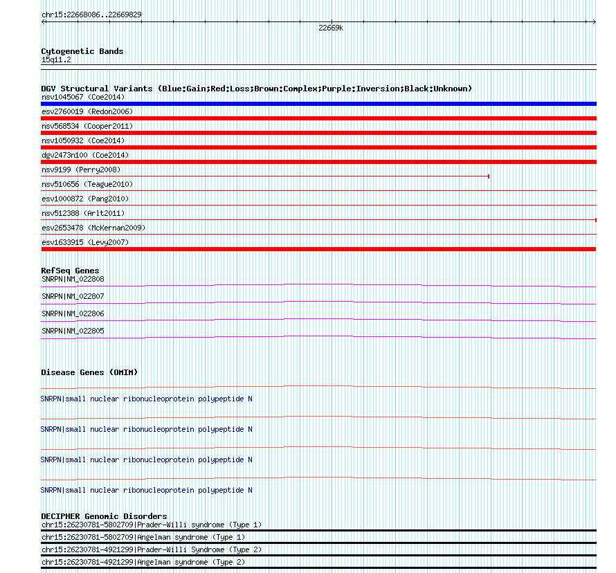 Variant DetailsVariant: esv1633915| Internal ID | 12797035 | | Landmark | | | Location Information | | | Cytoband | 15q11.2 | | Allele length | | Assembly | Allele length | | hg38 | 1744 | | hg19 | 1744 | | hg18 | 1744 |