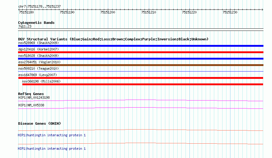 Variant DetailsVariant: esv1647869| Internal ID | 12810988 | | Landmark | | | Location Information | | | Cytoband | 7q11.23 | | Allele length | | Assembly | Allele length | | hg38 | 60 | | hg19 | 60 | | hg18 | 60 |