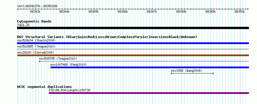 Variant DetailsVariant: esv16562 | Internal ID | 11033796 | | Landmark | | | Location Information | | | Cytoband | Xq21.31 | | Allele length | | Assembly | Allele length | | hg38 | 7911 | | hg19 | 7911 | | hg18 | 7911 |