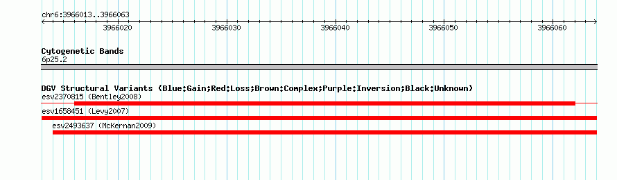 Variant DetailsVariant: esv1658451| Internal ID | 12821569 | | Landmark | | | Location Information | | | Cytoband | 6p25.2 | | Allele length | | Assembly | Allele length | | hg38 | 51 | | hg19 | 51 | | hg18 | 51 |