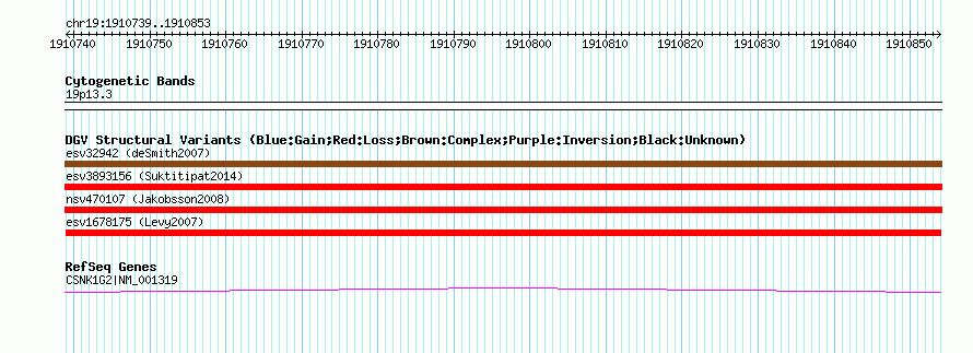 Variant DetailsVariant: esv1678175| Internal ID | 12841293 | | Landmark | | | Location Information | | | Cytoband | 19p13.3 | | Allele length | | Assembly | Allele length | | hg38 | 115 | | hg19 | 115 | | hg18 | 115 |