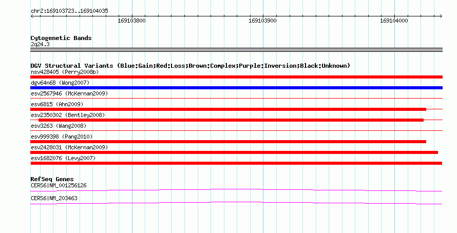 | | Variant Type | CNV deletion | | Copy Number | | | Allele State | | | Allele Origin | | | Probe Count | | | Validation Flag | | | Merged Status | M | | Merged Variants | | | Supporting Variants | essv3593713 | | Samples | HuRef | | Known Genes | CERS6 | | Method | Sequencing | | Analysis | | | Platform | Sanger Sequencing | | Comments | | | Reference | Levy_et_al_2007 | | Pubmed ID | 17803354 | | Accession Number(s) | esv1682076