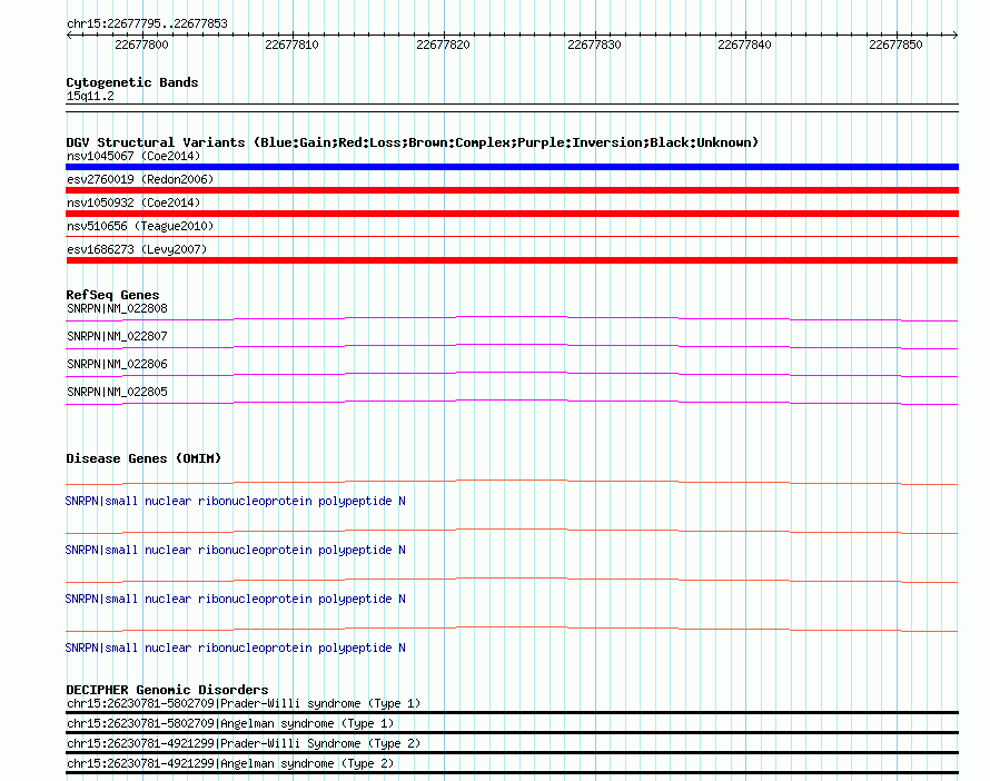 | | Variant Type | CNV deletion | | Copy Number | | | Allele State | | | Allele Origin | | | Probe Count | | | Validation Flag | | | Merged Status | M | | Merged Variants | | | Supporting Variants | essv3735303 | | Samples | HuRef | | Known Genes | SNRPN | | Method | Sequencing | | Analysis | | | Platform | Sanger Sequencing | | Comments | | | Reference | Levy_et_al_2007 | | Pubmed ID | 17803354 | | Accession Number(s) | esv1686273