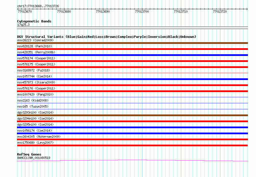 Variant DetailsVariant: esv1750680| Internal ID | 12913798 | | Landmark | | | Location Information | | | Cytoband | 17q25.3 | | Allele length | | Assembly | Allele length | | hg38 | 59 | | hg19 | 59 | | hg18 | 59 |
