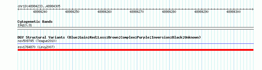 Variant DetailsVariant: esv1764870| Internal ID | 12927988 | | Landmark | | | Location Information | | | Cytoband | 19q13.31 | | Allele length | | Assembly | Allele length | | hg38 | 73 | | hg19 | 73 | | hg18 | 73 |
