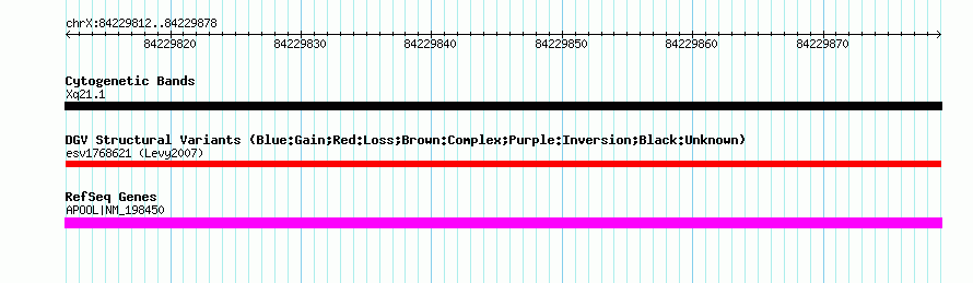 Variant DetailsVariant: esv1768621| Internal ID | 12931739 | | Landmark | | | Location Information | | | Cytoband | Xq21.1 | | Allele length | | Assembly | Allele length | | hg38 | 67 | | hg19 | 67 | | hg18 | 67 |