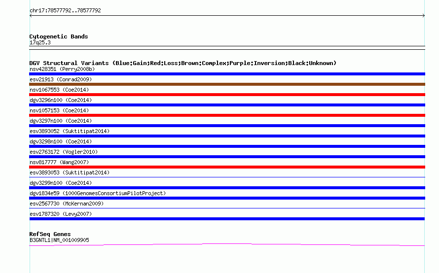 Variant DetailsVariant: esv1787320| Internal ID | 12950439 | | Landmark | | | Location Information | | | Cytoband | 17q25.3 | | Allele length | | Assembly | Allele length | | hg38 | 475 | | hg19 | 475 | | hg18 | 475 |