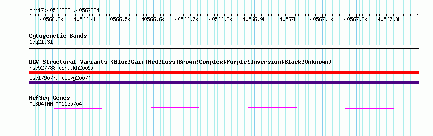 Variant DetailsVariant: esv1790779| Internal ID | 12953897 | | Landmark | | | Location Information | | | Cytoband | 17q21.31 | | Allele length | | Assembly | Allele length | | hg38 | 1152 | | hg19 | 1152 | | hg18 | 1152 |