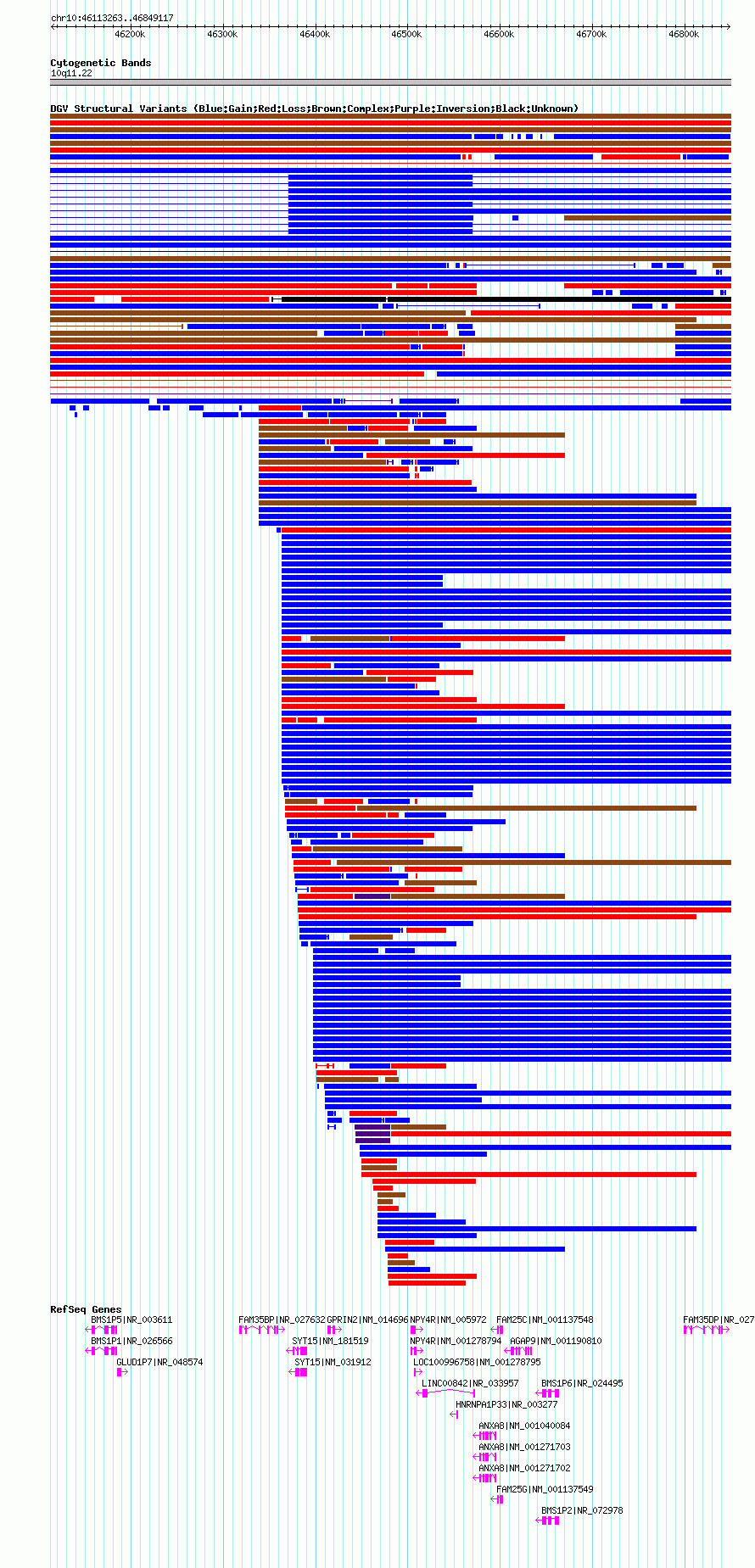 | | Variant Type | CNV loss | | Copy Number | | | Allele State | | | Allele Origin | | | Probe Count | | | Validation Flag | | | Merged Status | M | | Merged Variants | esv22204 | | Supporting Variants | essv39952 | | Samples | NA12878 | | Known Genes | AGAP9, ANXA8, BMS1P1, BMS1P2, BMS1P5, BMS1P6, FAM25C, FAM25G, FAM35BP, FAM35DP, GLUD1P7, GPRIN2, HNRNPA1P33, LINC00842, LOC100996758, NPY4R, SYT15 | | Method | Oligo aCGH | | Analysis | Segment log2 ratios from each sample. This was done running the GADA algorithm (Pique-Regi et al., 2008) using the options "-M 10 -T 10 -a 2.5". Filter non-CNV segments using intensity thresholds. Merge remaining CNV "calls" within each sample. Adjacent calls of the same direction (gain or loss) are merged if both: the distance between calls is less than 10kb, and the distance between calls is less than 10% of the size of the largest of the two calls. | | Platform | Sanger H. Sapiens 42mCGH Array 5781_53 726K v1 | | Comments | | | Reference | Conrad_et_al_2009 | | Pubmed ID | 19812545 | | Accession Number(s) | esv18141