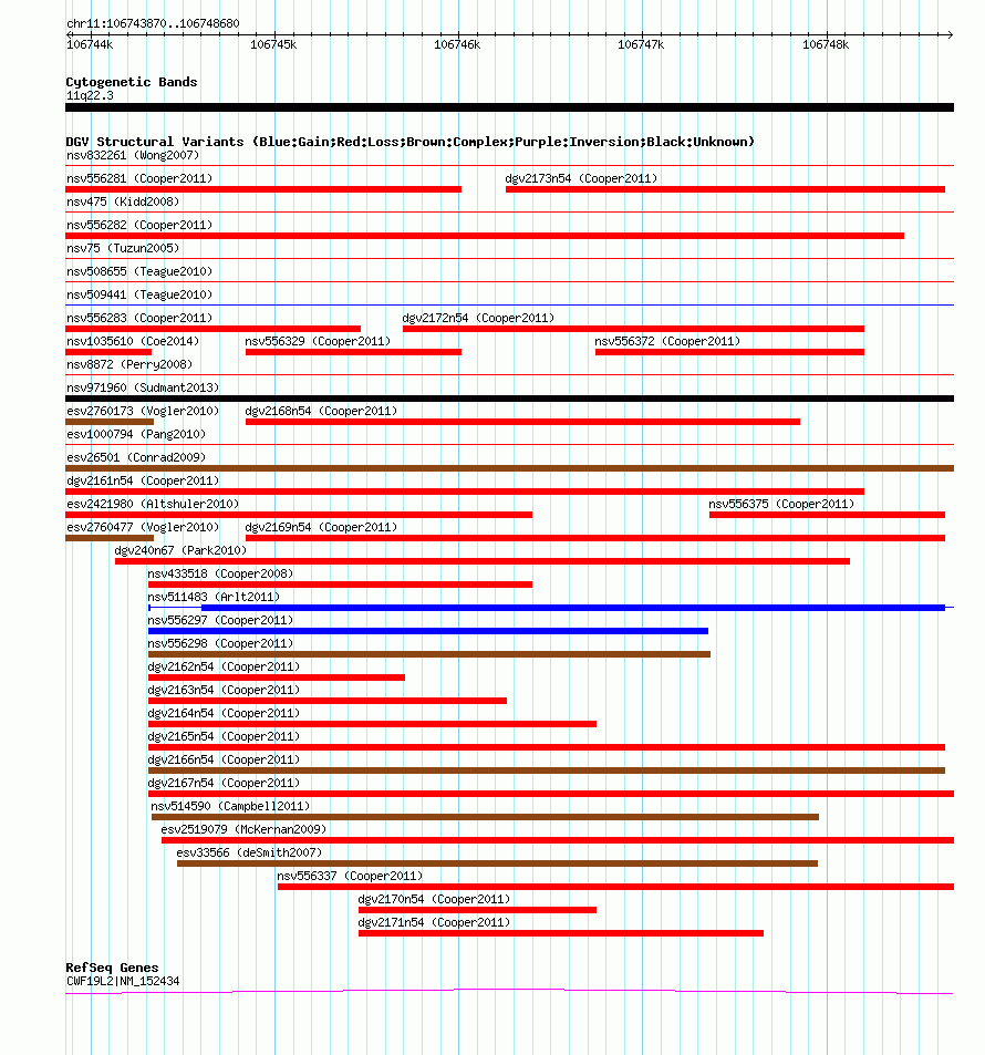 Variant DetailsVariant: esv18472 | Internal ID | 11382391 | | Landmark | | | Location Information | | | Cytoband | 11q22.3 | | Allele length | | Assembly | Allele length | | hg38 | 4811 | | hg19 | 4811 | | hg18 | 4811 |