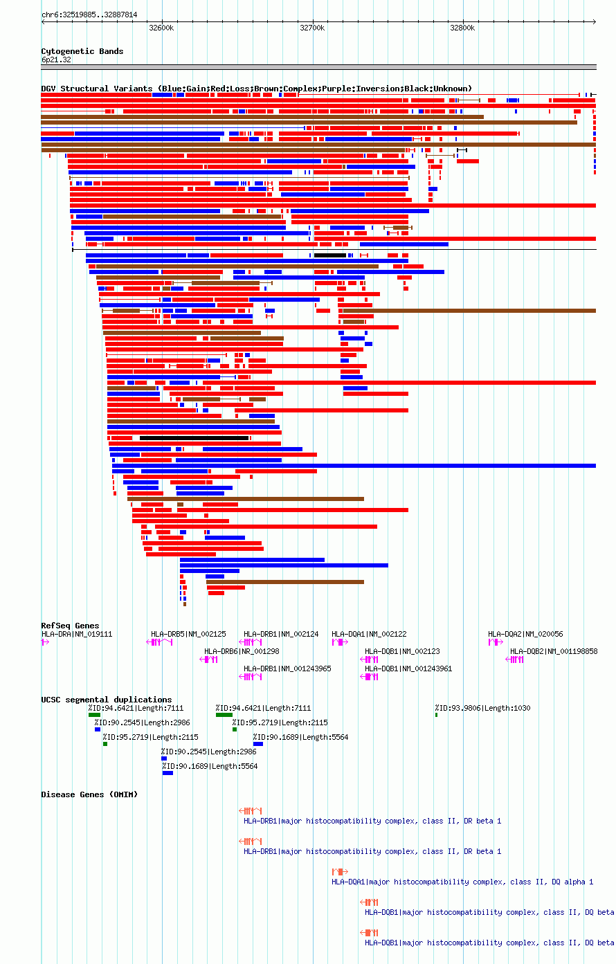 |  | Variant Type | CNV gain |  | Copy Number |  |  | Allele State |  |  | Allele Origin |  |  | Probe Count |  |  | Validation Flag |  |  | Merged Status | M |  | Merged Variants | esv21985 |  | Supporting Variants | essv78375, essv57700, essv64854, essv82097, essv51920 |  | Samples | NA11993, NA07045, NA19114, NA06985, NA12006 |  | Known Genes | HLA-DQA1, HLA-DQA2, HLA-DQB1, HLA-DQB2, HLA-DRA, HLA-DRB1, HLA-DRB5, HLA-DRB6 |  | Method | Oligo aCGH |  | Analysis | Segment log2 ratios from each sample. This was done running the GADA algorithm (Pique-Regi et al., 2008) using the options "-M 10 -T 10 -a 2.5". Filter non-CNV segments using intensity thresholds. Merge remaining CNV "calls" within each sample. Adjacent calls of the same direction (gain or loss) are merged if both: the distance between calls is less than 10kb, and the distance between calls is less than 10% of the size of the largest of the two calls. |  | Platform | Sanger H. Sapiens 42mCGH Array 5781_53 726K v1 |  | Comments |  |  | Reference | Conrad_et_al_2009 |  | Pubmed ID | 19812545 |  | Accession Number(s) | esv18770