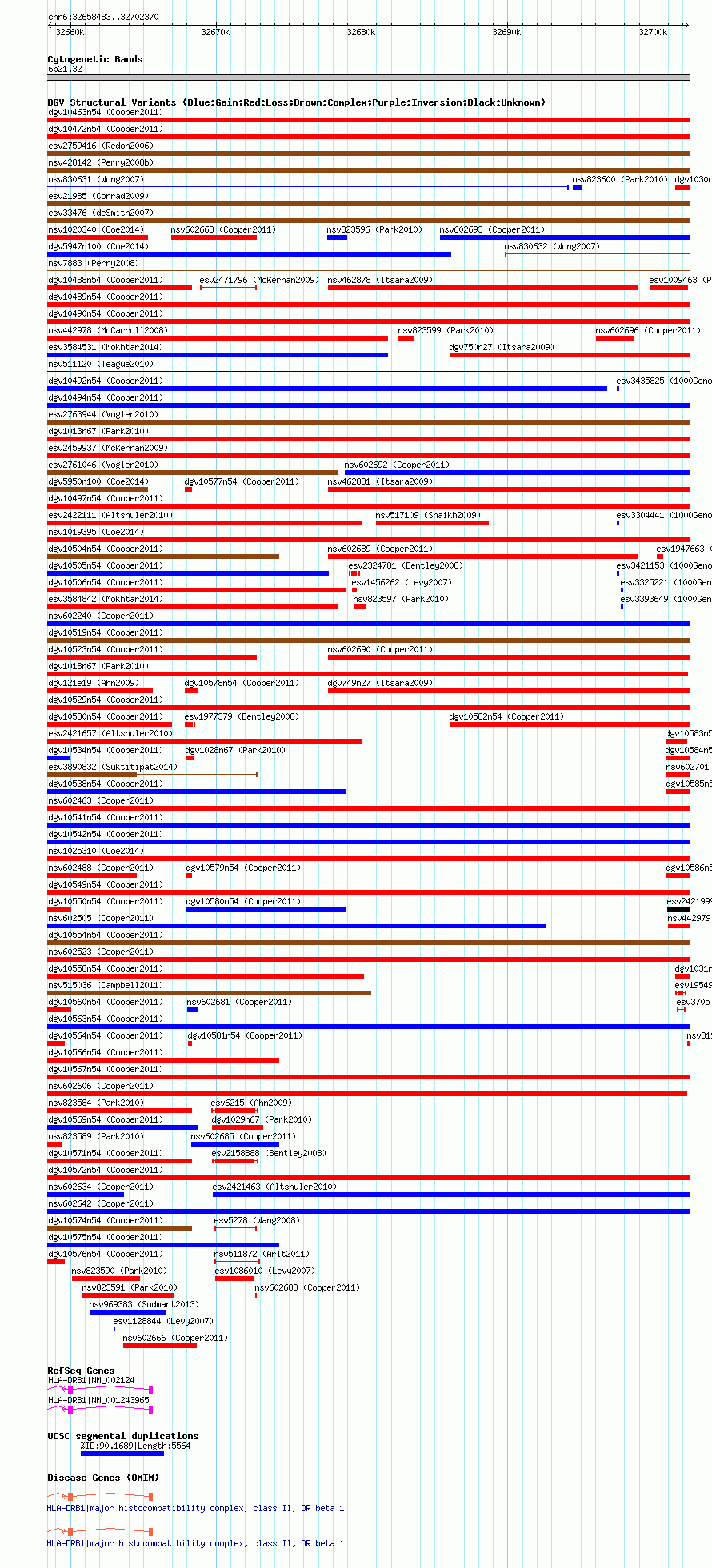 | Variant DetailsVariant: esv20089| Internal ID | 11037323 |  | Landmark |  |  | Location Information |  |  | Cytoband | 6p21.32 |  | Allele length | | Assembly | Allele length |  | hg38 | 43888 |  | hg19 | 43888 |  | hg18 | 43888 |