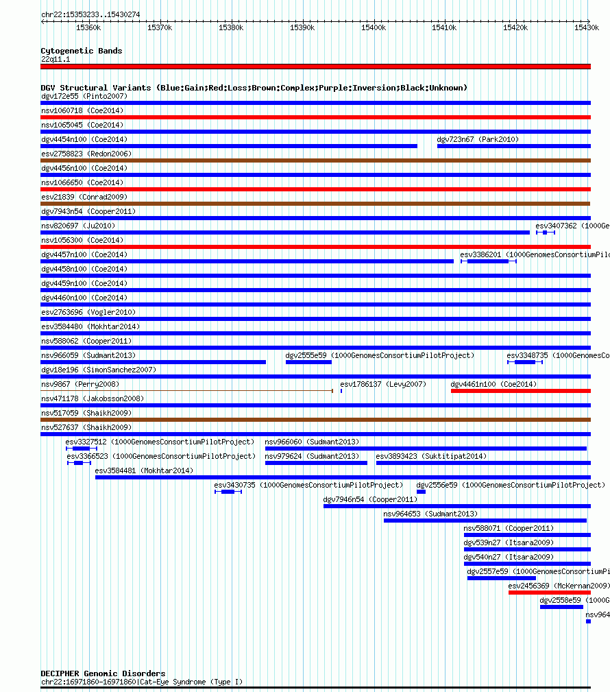 Variant DetailsVariant: esv20308 | Internal ID | 11384227 | | Landmark | | | Location Information | | | Cytoband | 22q11.1 | | Allele length | | Assembly | Allele length | | hg38 | 77042 | | hg19 | 77042 | | hg18 | 77042 |