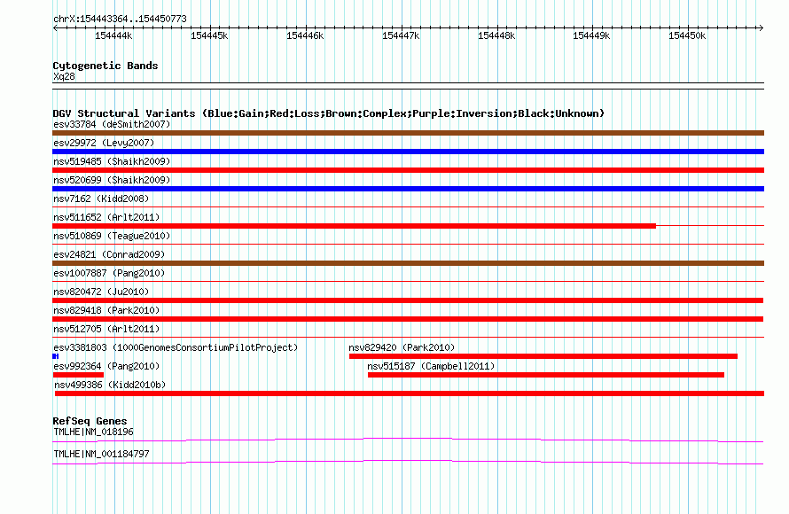 Variant DetailsVariant: esv20313 | Internal ID | 11384232 | | Landmark | | | Location Information | | | Cytoband | Xq28 | | Allele length | | Assembly | Allele length | | hg38 | 7410 | | hg19 | 7410 | | hg18 | 7410 |