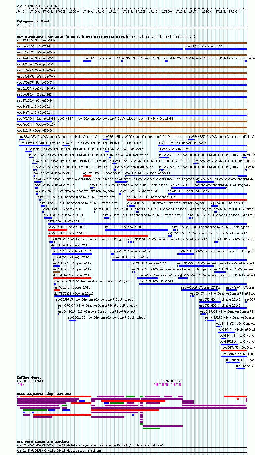 Variant DetailsVariant: esv20957 Internal ID | 11038191 | Landmark | | Location Information | | Cytoband | 22q11.21 | Allele length | Assembly | Allele length | hg38 | 667583 | hg19 | 172329 | hg18 | 172329 |