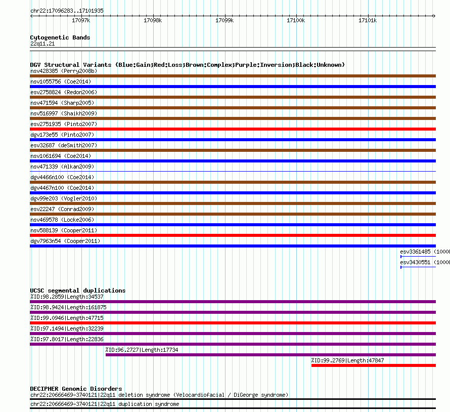 Variant DetailsVariant: esv21240 Internal ID | 11038474 | Landmark | | Location Information | | Cytoband | 22q11.21 | Allele length | Assembly | Allele length | hg38 | 5653 | hg19 | 5653 | hg18 | 5653 |