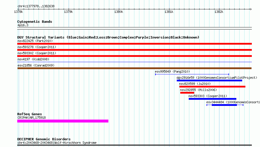 | Variant Type | CNV gain+loss | Copy Number | | Allele State | | Allele Origin | | Probe Count | | Validation Flag | | Merged Status | M | Merged Variants | | Supporting Variants | esv11906, esv14957, esv11309 | Samples | NA11995, NA18861, NA18508, NA12414, NA11931, NA19190, NA18916, NA12287, NA12156, NA12828, NA12878, NA18907, NA07045, NA12239, NA19225, NA06985, NA18523, NA18909, NA19147, NA07037, NA12749, NA18505, NA19129, NA12006, NA12776 | Known Genes | CRIPAK | Method | Oligo aCGH | Analysis | Segment log2 ratios from each sample. This was done running the GADA algorithm (Pique-Regi et al., 2008) using the options "-M 10 -T 10 -a 2.5". Filter non-CNV segments using intensity thresholds. Merge remaining CNV "calls" within each sample. Adjacent calls of the same direction (gain or loss) are merged if both: the distance between calls is less than 10kb, and the distance between calls is less than 10% of the size of the largest of the two calls. | Platform | Sanger H. Sapiens 42mCGH Array 5781_53 726K v1 | Comments | | Reference | Conrad_et_al_2009 | Pubmed ID | 19812545 | Accession Number(s) | esv21856