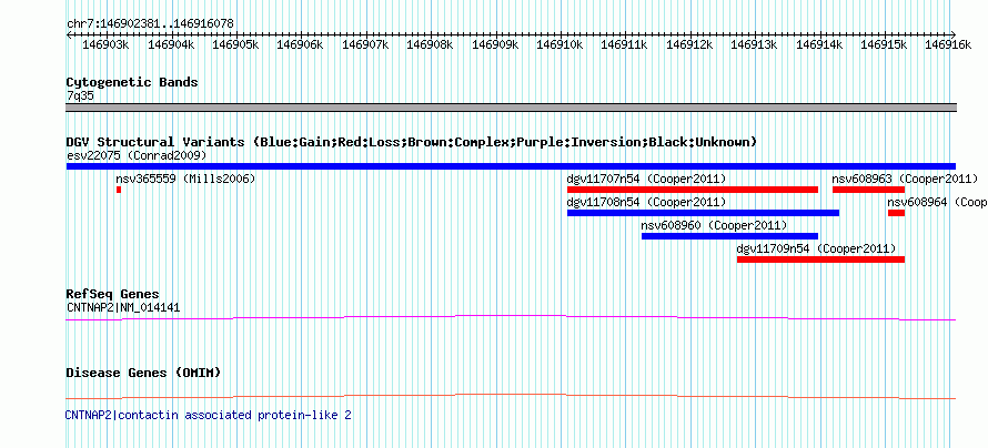 | | Variant Type | CNV gain | | Copy Number | | | Allele State | | | Allele Origin | | | Probe Count | | | Validation Flag | | | Merged Status | M | | Merged Variants | | | Supporting Variants | esv19066, esv20953 | | Samples | NA12156, NA18907, NA11894, NA15510, NA18858, NA12749 | | Known Genes | CNTNAP2 | | Method | Oligo aCGH | | Analysis | Segment log2 ratios from each sample. This was done running the GADA algorithm (Pique-Regi et al., 2008) using the options "-M 10 -T 10 -a 2.5". Filter non-CNV segments using intensity thresholds. Merge remaining CNV "calls" within each sample. Adjacent calls of the same direction (gain or loss) are merged if both: the distance between calls is less than 10kb, and the distance between calls is less than 10% of the size of the largest of the two calls. | | Platform | Sanger H. Sapiens 42mCGH Array 5781_53 726K v1 | | Comments | | | Reference | Conrad_et_al_2009 | | Pubmed ID | 19812545 | | Accession Number(s) | esv22075