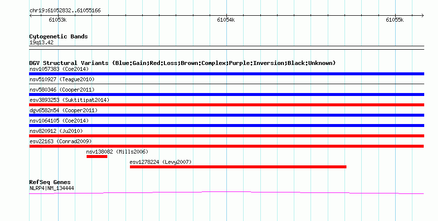 | Variant Type | CNV loss | Copy Number | | Allele State | | Allele Origin | | Probe Count | | Validation Flag | | Merged Status | M | Merged Variants | | Supporting Variants | esv20353 | Samples | NA18502, NA11995, NA18508, NA12414, NA11931, NA18916, NA12156, NA12044, NA11993, NA12878, NA12239, NA15510, NA19099, NA06985, NA18858, NA18909, NA18517, NA07037, NA18511 | Known Genes | NLRP4 | Method | Oligo aCGH | Analysis | Segment log2 ratios from each sample. This was done running the GADA algorithm (Pique-Regi et al., 2008) using the options "-M 10 -T 10 -a 2.5". Filter non-CNV segments using intensity thresholds. Merge remaining CNV "calls" within each sample. Adjacent calls of the same direction (gain or loss) are merged if both: the distance between calls is less than 10kb, and the distance between calls is less than 10% of the size of the largest of the two calls. | Platform | Sanger H. Sapiens 42mCGH Array 5781_53 726K v1 | Comments | | Reference | Conrad_et_al_2009 | Pubmed ID | 19812545 | Accession Number(s) | esv22163